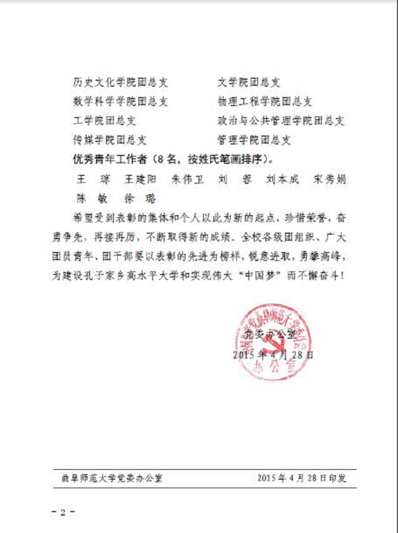 4月29日晚,2014年度“五四红旗团总支”和“优秀青年工作者”颁奖仪式在孔子文化广场举行。av中文 荣获“五四红旗团总支”荣誉称号,av中文 团总支书记王琼荣获“优秀青年工作者”荣誉称号。